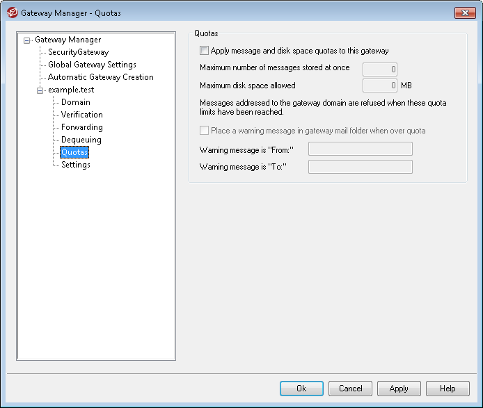Enable this option if you wish to designate a maximum number of messages allowed to be stored for the domain or a maximum amount of disk space (in kilobytes) that it can use. This includes any decoded file attachments in its Files directory. When a quota is reached, any further incoming messages addressed to the domain will be refused.