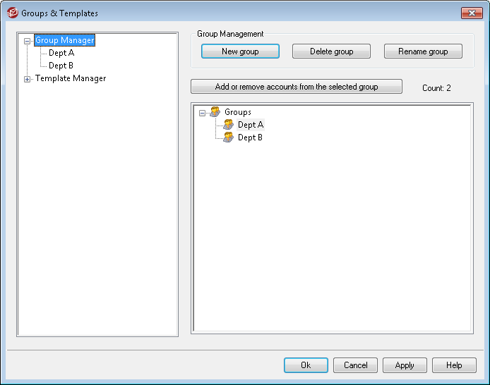 To create a new Account Group, click New group, type a name and description for the group, and click OK. The new group will appear in the list of groups below and in the left pane.