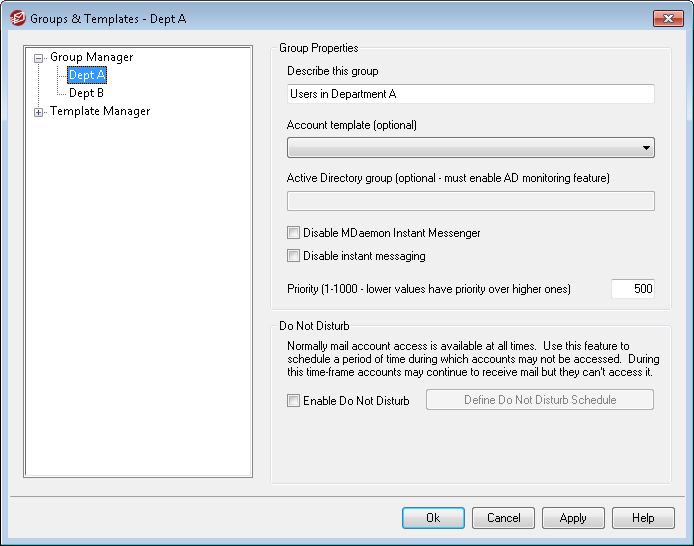 The Group Properties screen (Accounts » Groups & Templates... » [group name]) is used to configure the settings for each group you have created using the Group Manager. To open Group Properties from the Group Manager, double-click the group you wish to edit, or click the name of the group in the left pane. On this screen you can assign an Account Template to a group, allowing you to control a variety of account settings for group members. You can also link the group to an Active Directory group, control whether or not group members have access to MDaemon Instant Messenger (MDIM) and instant messaging, and set a priority level for the group. To control group membership, use the Group Manager and Mail Folder & Groups screen on the Account Editor.