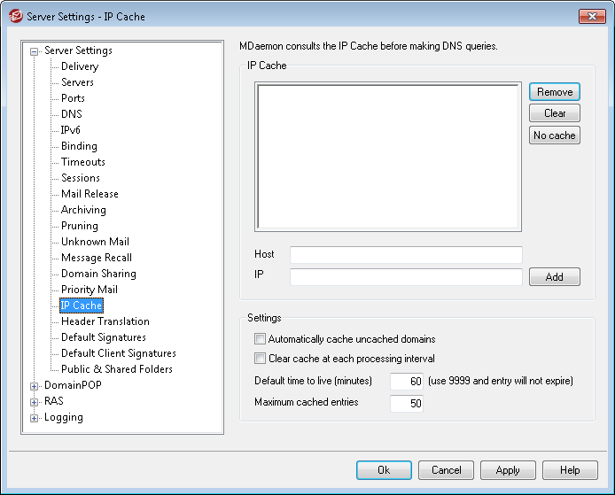 In order to speed message delivery and shorten mail processing time, MDaemon caches the IP addresses of all hosts with which it comes in contact. These IPs are stored and then the cache is checked each time MDaemon requires a DNS resolution on a host name. If the host name needing resolution is found in the IP cache then the DNS lookup is skipped, which can save a surprising amount of processing time. The settings in this window allow you to manipulate the parameters under which the cache will operate. You may also manually add and remove entries, set the maximum size of the cache, and designate how long entries will remain cached. The IP Cache can be reached from the "Setup » Server Settings » IP Cache" menu selection.