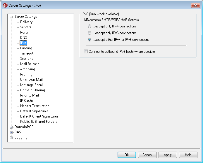 By default MDaemon detects the level of IPv6 capability that your OS supports and dual-stacks where possible. Otherwise, MDaemon monitor both IPv4 and IPv6 independently.