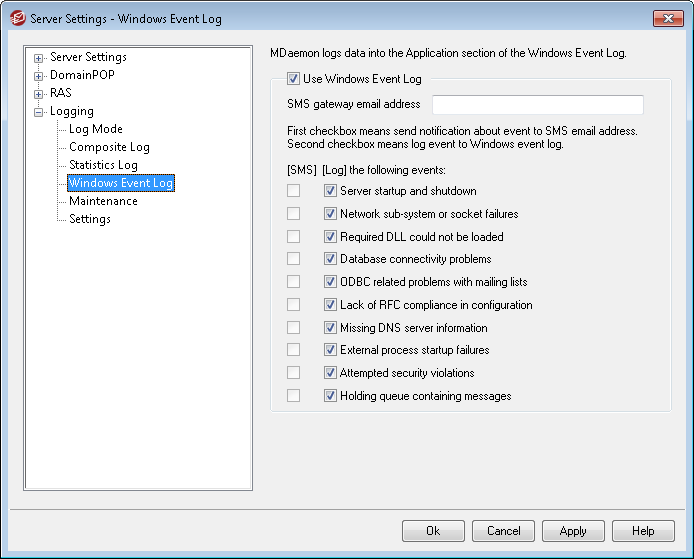 Use the SMS options to designate the events you wish to send to a device via text message. Use the Log options to designate the events that you wish to log to the Application section of the Windows Event log. To send SMS messages you must specify the email address of your phone carrier's email-to-SMS gateway in the option above. Further, any event that triggers a notification message to the SMS gateway will cause the remote queue to be processed; the notifications will be treated as and "urgent" email.