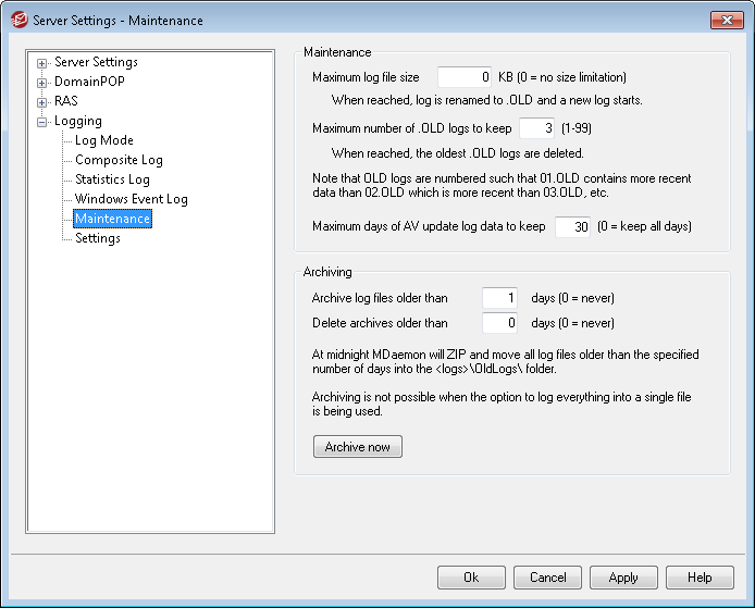 Use this option if you want MDaemon to delete archived log files automatically when their age exceeds the number of days specified here. Use "0" in this option if you do not wish to delete archives automatically. Archive deletion occurs during the daily midnight cleanup event.