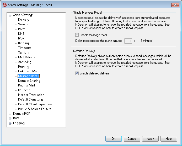 This is the number of minutes that MDaemon will hold incoming messages from authenticated local users. If a RECALL message is received during the delay period then MDaemon will delete the referenced message. This option can be set to 1-15 minutes. 1 minutes is the default setting.