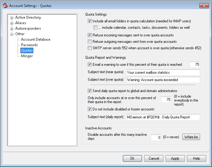 Use this option if you wish to customize the subject text of the daily quota report that MDaemon sends to the administrators. See QuotaReport.dat in the MDaemon\APP folder if you wish to customize the report itself.