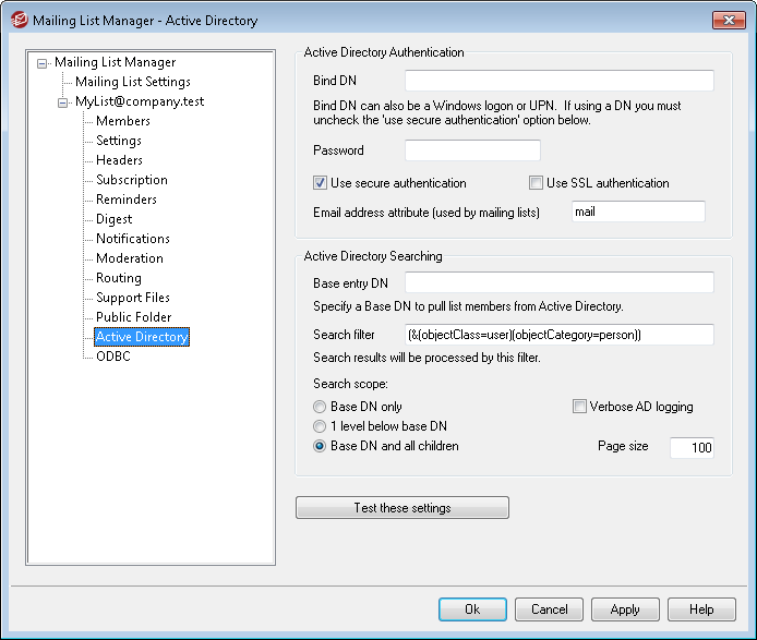 Specify the Distinguished Name (DN) or starting point in the Directory Information Tree (DIT) at which MDaemon will search Active Directory for addresses. You can use "LDAP://rootDSE" in this option to begin searching at Root DSE, which is the topmost entry in your Active Directory hierarchy. Designating a more precise starting point closer to the location of your user accounts or desired group of addresses in your particular Active Directory tree can reduce the amount of time required to search the DIT. Leave this field blank if you do not wish to pull any list addresses from Active Directory.