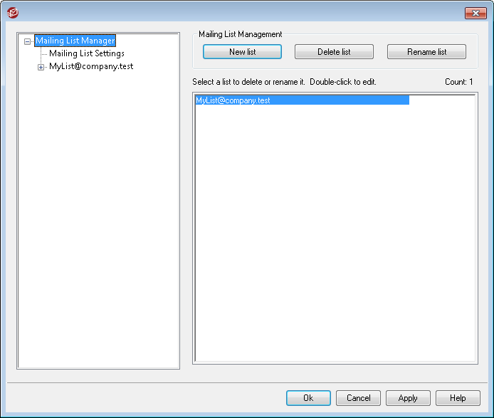 To create a new mailing list, click New list to open the Mailing List Email Address dialog. Create a mailbox name and select a domain, such as "MyList" and "example.com" respectively. This will be the mailing list's email address (i.e. MyList@example.com). Messages sent to this address will be distributed to members of the list, based on the list's particular settings. Click OK to create the list. After creating the list you can double-click its entry to configure its settings and add members. Note: List names cannot contain " ! " or " | "