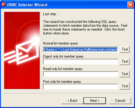| 7. | The ODBC Selector Wizard will construct an SQL query statement based on your selections in Step 6. MDaemon will use it to retrieve normal list member data from your database. You can edit this statement as desired, and include other query statements in the remaining controls to cause members to receive messages in Digest mode, and to designate members as Read Only or Post Only. A Test button is provided beside each control so that you can test your query statements to make sure they retrieve the proper data. When you are finished configuring your query statements, click Next. |