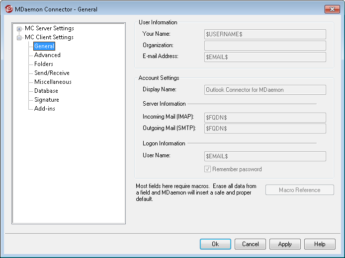 When you have enabled the "Push client settings to MC users" option on the MC Client Settings screen, the settings on this screen will be pushed to the corresponding screen in the MDaemon Connector client whenever an MDaemon Connector user connects to the server. The MC Client Settings are only sent to clients when one of the settings has changed since the last time the client connected and received them. Most of the fields on this screen should contain macros rather than static values. See Macro Reference below.