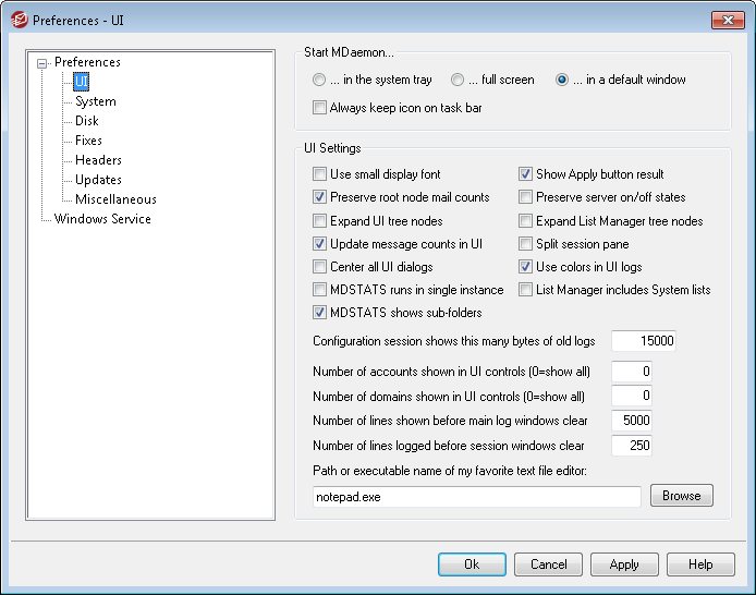 Notepad.exe is the general text editor that the MDaemon UI will launch by default when needed. If you prefer to use a different text editor, enter its file path or executable name here.