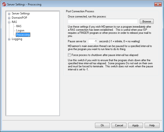 Sometimes the program you need to run may not exit once it has run its course; some programs require user intervention in order to close them down. This is not acceptable when the software must run unattended. If this switch is selected MDaemon will force the process thread to terminate once the number of seconds specified in Pause Server For XX Seconds has elapsed. This function does not work when the server is configured to wait indefinitely for the process to return.