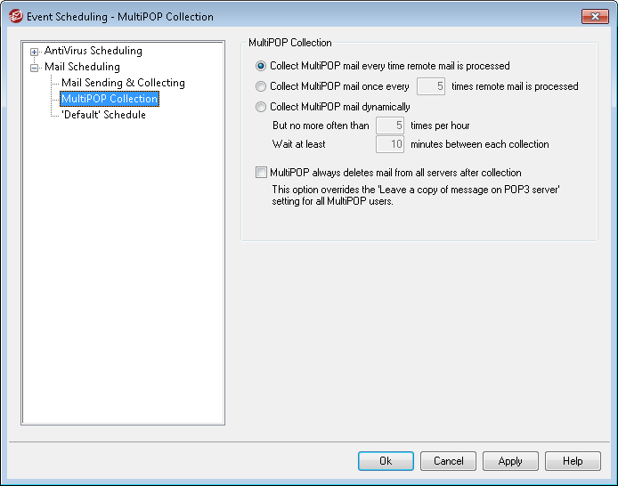 Choose this option if you wish to collect MultiPOP messages dynamically. Ordinarily, MultiPOP is collected for all users at the same time at each remote mail processing interval, or at every x number of intervals. When collected dynamically, MultiPOP messages are collected for each individual user when that user checks his or her local mail via POP, IMAP, or Webmail rather than for all users at once. However, because MultiPOP collection is triggered by a user checking his email, any new MultiPOP messages collected will not be visible to the user until he checks his mail again. Thus, he would need to check his mail twice in order to see new MultiPOP messages. The first time to trigger MultiPOP and a second time to see the mail that was collected.