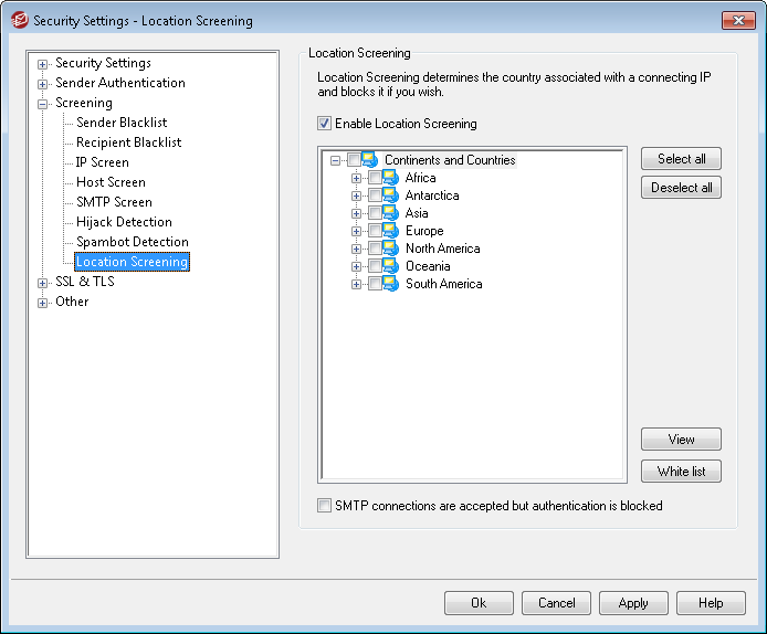 To use Location Screening, click this box, click the box next to any regions or countries that you wish to block, and click Ok or Apply.