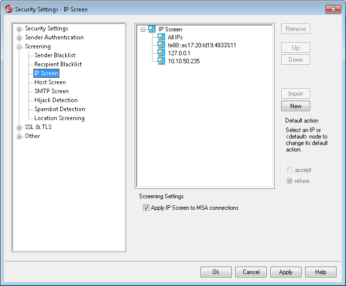 The IP Screen is located under: Security » Security Settings » Screening. It is used to define specific remote IP addresses that will be allowed to connect, or not allowed to connect, to your local IP addresses. The remote IP addresses you place on the IP Screen can be associated with either all of you local IP addresses or with individual IPs. CIDR notation and the wildcards *, #, and ? are allowed.