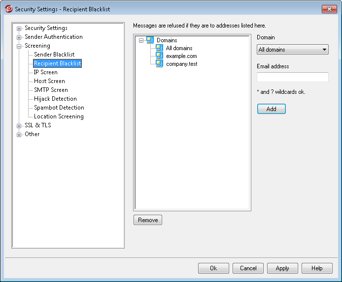 The Recipient Blacklist is located at: Security » Security Settings » Screening. This list contains email addresses that are not allowed to receive mail through your server. If a message arrives for an address on this list, it will be refused. Addresses may be blacklisted on a per domain basis or globally (applied to all MDaemon domains). The Recipient Blacklist operates on SMTP envelope RCPT data only (not message headers).