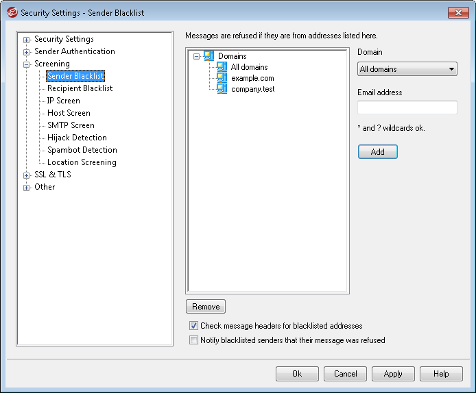 The Sender Blacklist is located at: Security » Security Settings » Screening. This list contains addresses that are not allowed to send mail traffic through your server. If a message arrives from an address on this list, it will be refused during the SMTP session. This is useful for controlling problem users. Addresses may be blacklisted on a per domain basis or globally (applied to all MDaemon domains).