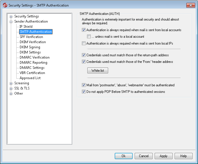 Click this checkbox to require messages claiming to be from one of your "postmaster@...", "abuse@..." or "webmaster@..." aliases or accounts to be authenticated before MDaemon will accept them. Spammers and hackers know that these addresses might exist, and may therefore attempt to use one of them to send mail through your system. This option will prevent them and other unauthorized users from being able to do so. This option is mirrored on the Settings screen of Aliases. Changing the setting here will change it there as well.