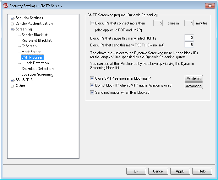 Using the SMTP Screen you can block IP addresses that connect to MDaemon too many times within a specified number of minutes. You can also block those the cause too many failed RCPTs, and those that send too many RSET commands. The SMTP Screen requires Dynamic Screening and uses the Dynamic Blacklist and Dynamic Whitelist.