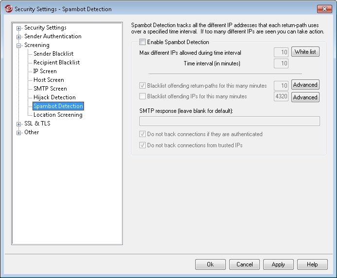 Spambot Detection tracks the IP addresses that every SMTP MAIL (return-path) value uses over a given period of time. If the same return-path is used by an inordinate number of different IP addresses in a short time, this could indicate a spambot network. When a spambot is detected, the current connection is immediately dropped and the return-path value is optionally blacklisted for a length of time you specify You can also optionally blacklist all the known spambot IP addresses for a designated period.