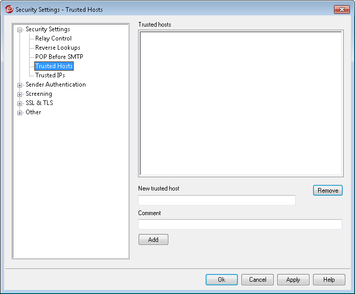 On various dialogs and security features throughout MDaemon you will see options that allow you to choose whether or not "Trusted Hosts" or "Trusted Domains" will be exceptions to or exempt from those options. The hosts you list on this screen are the ones to which those options refer.