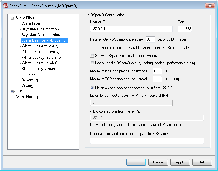 MDaemon's spam filtering system runs as a separate daemon—the MDaemon Spam Daemon (MDSpamD), which is fed messages via TCP/IP for scanning. This greatly increases the Spam Filter's performance and makes it possible for you to run MDSpamD locally, on a separate computer, or have MDaemon use another MDSpamD (or any other Spam Daemon enabled product) running at some other location. By default MDSpamD runs locally and receives messages on port 783 at 127.0.0.1, but you can configure a different port and IP address if wish to send the messages to some other spam daemon running at a different location or on a different port.