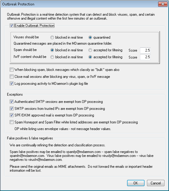 False positives, or classifying a legitimate message improperly as part of an outbreak, should rarely if ever happen. Should a false positive occur, however, you can send that message to us at spamfp@mdaemon.com for spam/phishing false positives or virusfp@mdaemon.com for virus false positives, so that we can use it to help refine and improve our detection and classification processes.