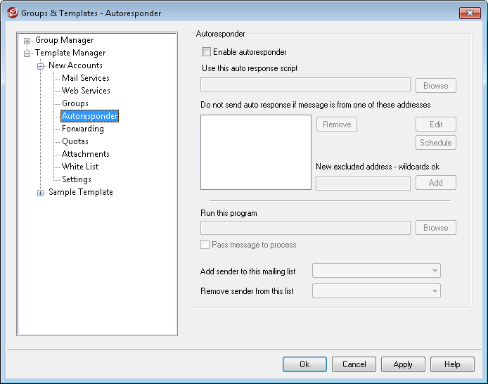 The options on this template screen correspond to the options located on the Account Editor's Autoresponder screen. When a template is set to control this screen, it will control the Autoresponder options for any account belonging to a Group that utilizes the template.