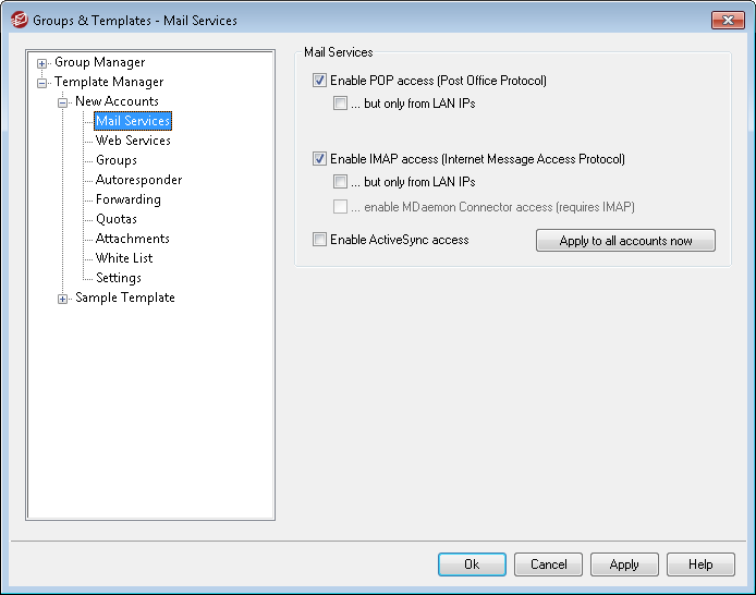 This option is only available on the New Accounts template. Click this button to apply this screen's settings immediately to the Mail Services and ActiveSync for MDaemon screens of all existing MDaemon accounts.
