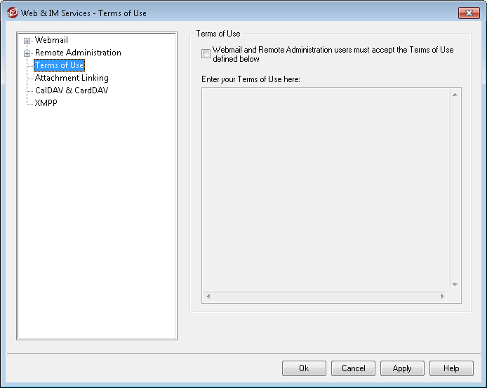 Check this box and enter your Terms of Use statement in the space provided if you wish to require Webmail and Remote Administration users to accept the Terms of Use statement each time they sign in.