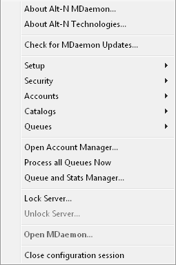 Next, there are commands to lock and unlock MDaemon's interface (See "Locking/Unlocking MDaemon's Main Interface" below) followed by the "Open MDaemon..." menu selection, used for opening/restoring MDaemon's interface when it is minimized to the system tray.
