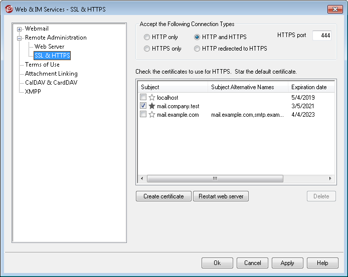 This screen only applies to Remote Administration when using MDaemon's built-in web server. If you configure Remote Administration to use some other web server such as IIS, these options will not be used — SSL/HTTPS support will have to be configured using your the other web server's tools. |