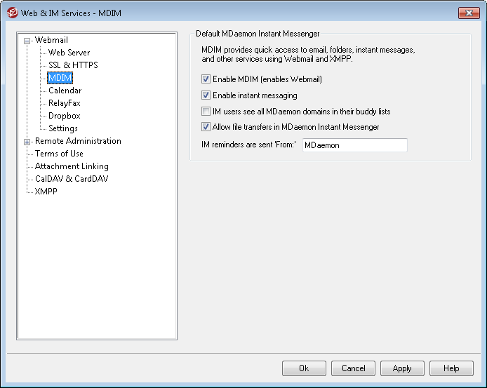 When an appointment is scheduled on a user's Webmail calendar, the event can be set to send a reminder to the user at a specified time. If the IM system is active for the user's domain then the reminder will be sent in an instant message to the user. Use this text box to specify the name that you wish the message to appear to be 'From:'. This is the default setting for new domains. You can change it for specific domains via the Domain Manager's MDaemon Instant Messenger screen.
