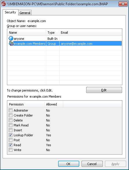 Access rights are controlled through MDaemon's support for Access Control Lists (ACL). ACL is an extension to the Internet Message Access Protocol (IMAP4), which makes it possible for you to create an access list for each of your IMAP message folders, thus granting folder access rights to other users who also have accounts on your mail server. If your email client doesn't support ACL you can still set the permissions via the controls on this dialog.