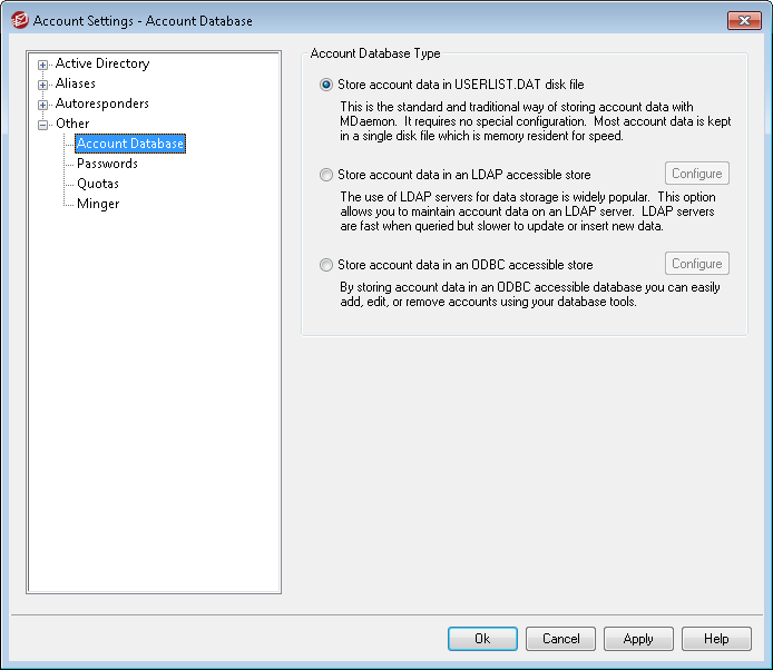 The Account Database dialog (located under Accounts » Account Settings) is used to designate the method that you want MDaemon to use to maintain your user accounts: ODBC, LDAP, or the local USERLIST.DAT system.