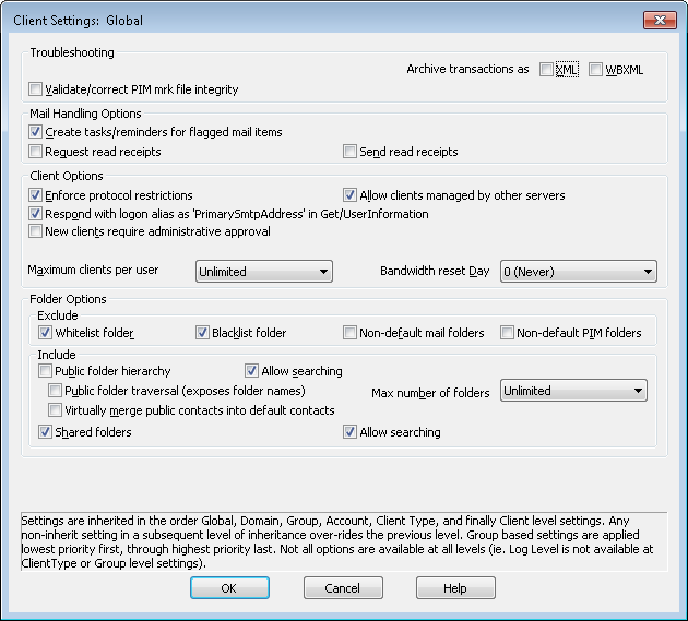 This screen contains the global settings for managing ActiveSync clients. There are corresponding client settings under ActiveSync's other pages, such as Domains, Accounts, and Clients, for setting these options per domain, per account, and per client respectively. The global settings are set to specific values, but the domain, account, client, and other settings are by default set to Inherit their settings from their respective parent options. Therefore changing any setting on this screen will effectively change the same setting on all child screens, allowing you by default to manage all clients on the server by changing only the settings on this one screen. Conversely, changing a setting on a child screen will override its parent setting, allowing you to alter the settings at the domain, account, or other level if necessary.
