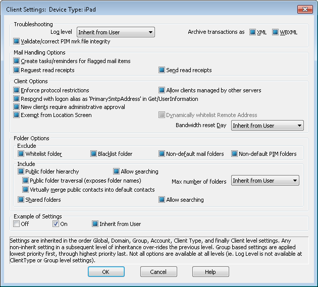 If you wish to define customized ActiveSync Client Settings for a specific type of ActiveSync client, use this screen to manage those settings. The Client-Type of all clients currently authorized to use ActiveSync are listed here, and each Client-Type's entry indicates whether or not its settings have been defined. To edit a Client-Type's Client Settings, double-click the entry, or right-click it and click Customize Client Settings. You can also right-click an entry to remove the customized settings or add or remove the Client-Type from the ActiveSync Whitelist or Blacklist.