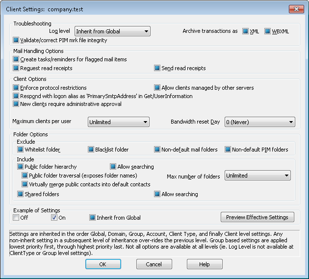 This button is available on all of the child Client Settings screens (i.e. domains, accounts, and clients). Since by default the options on those screens are set to inherit their settings from a parent screen, use this feature to see what settings are currently being applied to the displayed screen.