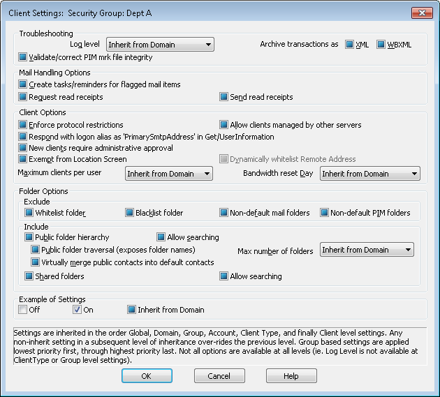 By default each Group client setting is set to inherit its state from the user's Domain Client Settings. Changing a group setting will override the domain setting for any account that is a member of the group. If you do not want the Group Client Settings to apply to a specific group member or device, then you can override the group settings by editing the Client Settings for the Account, Client Type, or Client.