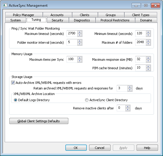 This screen contains advanced options, which in most cases will not need to be adjusted, and it contains a button to open the Global Client Settings Defaults dialog, to adjust the default settings used for ActiveSync clients.