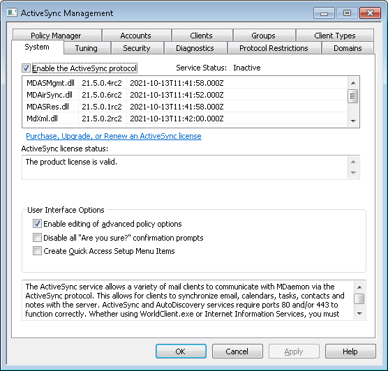 Enable this option if you want the Advanced Settings tab to be visible on the ActiveSync Policy Editor. It contains various advanced policy settings that in most cases will not need to be changed. This option is disabled by default.