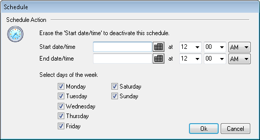 Click this button to open the Schedule dialog on which you can set a start and end date and time for the Autoresponder, and set the days of the week for it to be active. Leave the Schedule blank if you want the Autoresponder to be active continually.