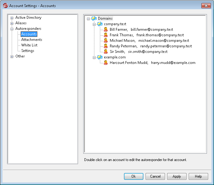 This area lists all available local mailboxes that can host an autoresponder. Double-click an account in this list to open its corresponding Autoresponder screen, which is used to configure an autoresponder for that account.