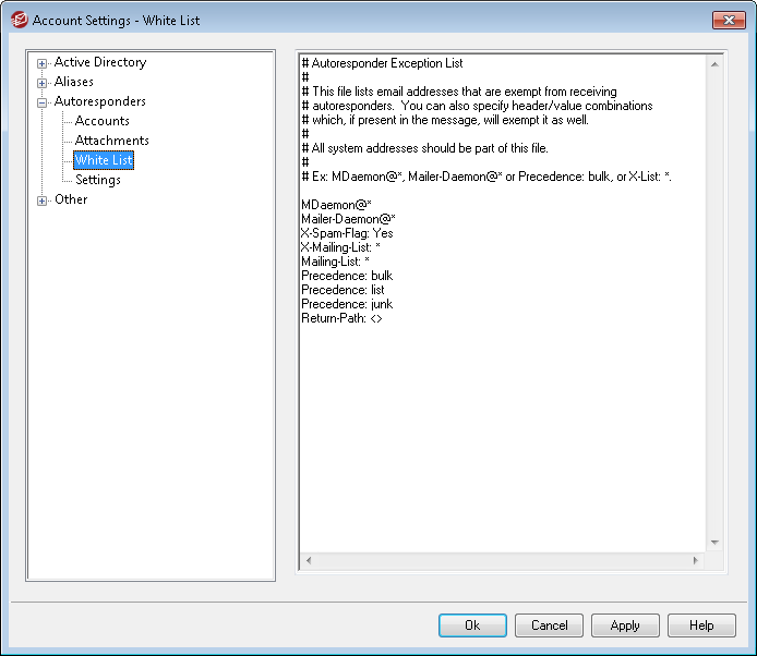 Use Autoresponder » White List to configure global exceptions to autoresponders. Messages from entries in this list will not receive any autoresponders. Both email addresses and header/value pairs can be included in the list. Enter one address or header/value pair per line. Wildcards are permitted.
