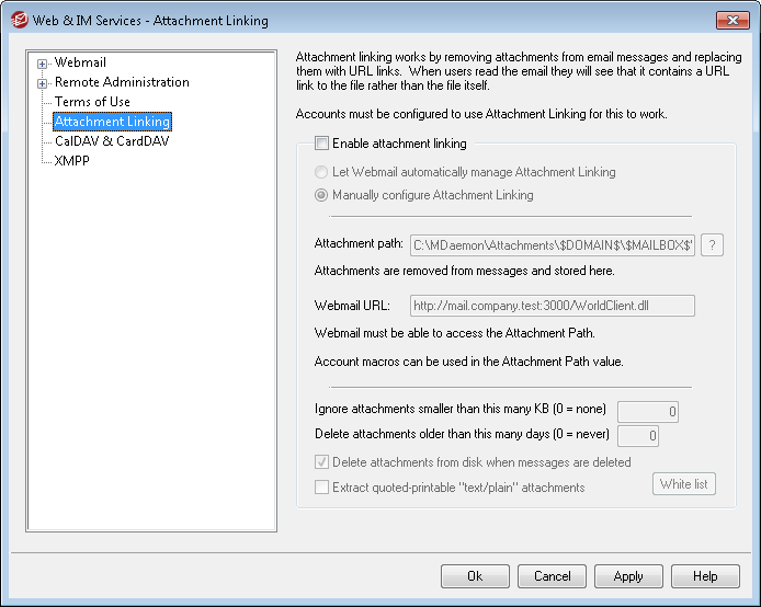 Enter Webmail's URL here (e.g. "http://mail.example.com:3000/WorldClient.dll"). MDaemon will use this URL when inserting the links to extracted attachments in messages.