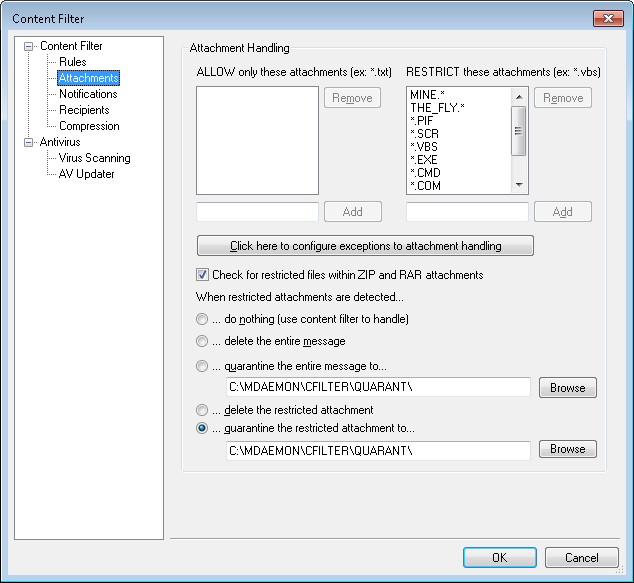 Click this option and specify a location if you wish to quarantine restricted attachments to a specific location rather than simply delete them. This is the default setting.