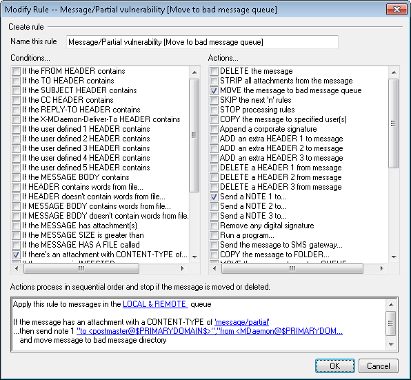MDaemon can perform these actions if a message matches the rule's conditions. A few Actions will require additional information that you will specify by clicking on the Action's hyperlink in the Rule Description box.