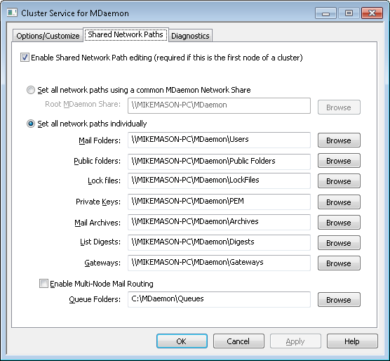 Use the options on this screen to set the shared network paths that will be used by the MDaemon cluster. This is required on the first node of the cluster so that the shared network paths can be replicated on the other nodes.