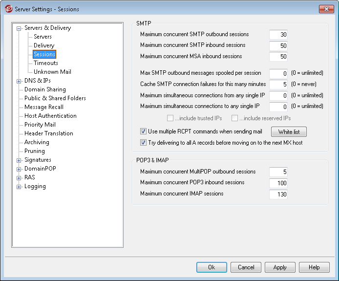 Use this option to limit the number of simultaneous connections that will be allowed to a single IP address during mail delivery. Use “0” if you do not wish to limit simultaneous connections.