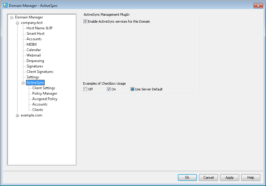 Use this section of the Domain Manager to administer the domain's ActiveSync settings. You can manage the ActiveSync settings and defaults for all domains from the ActiveSync Manager's Domains screen.