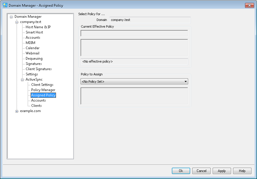 To assign a default ActiveSync policy for the domain, click the Policy to Assign drop-down list, select the desired policy, and click Ok.